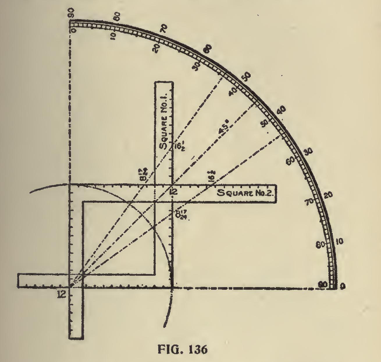 In Fig. 135 the lines are at 18 degrees on the square at the lower point of the star, and as will be seen, gives the miter for a frame star shape, the tongue giving the angle. From this it will be seen that the tongues of these squares are in a direct line with the center of the star. The squares at the top are set at 36 degrees, with their tongues in line with the 18 degree lines from the two lower squares, and form the angles for other parts of the star.