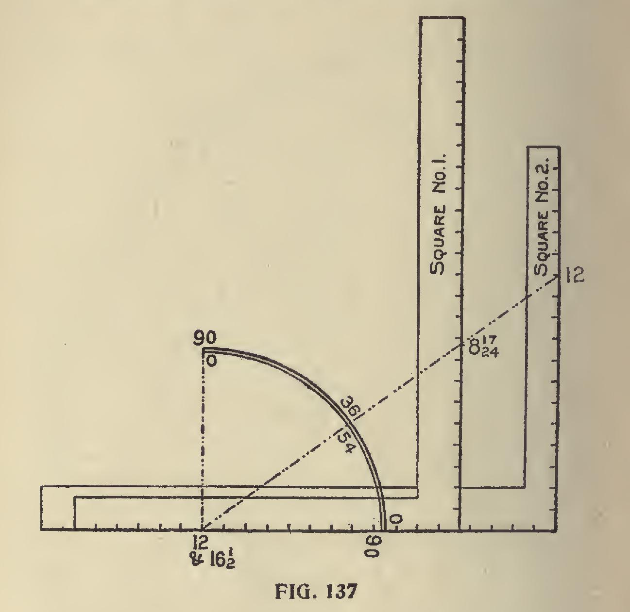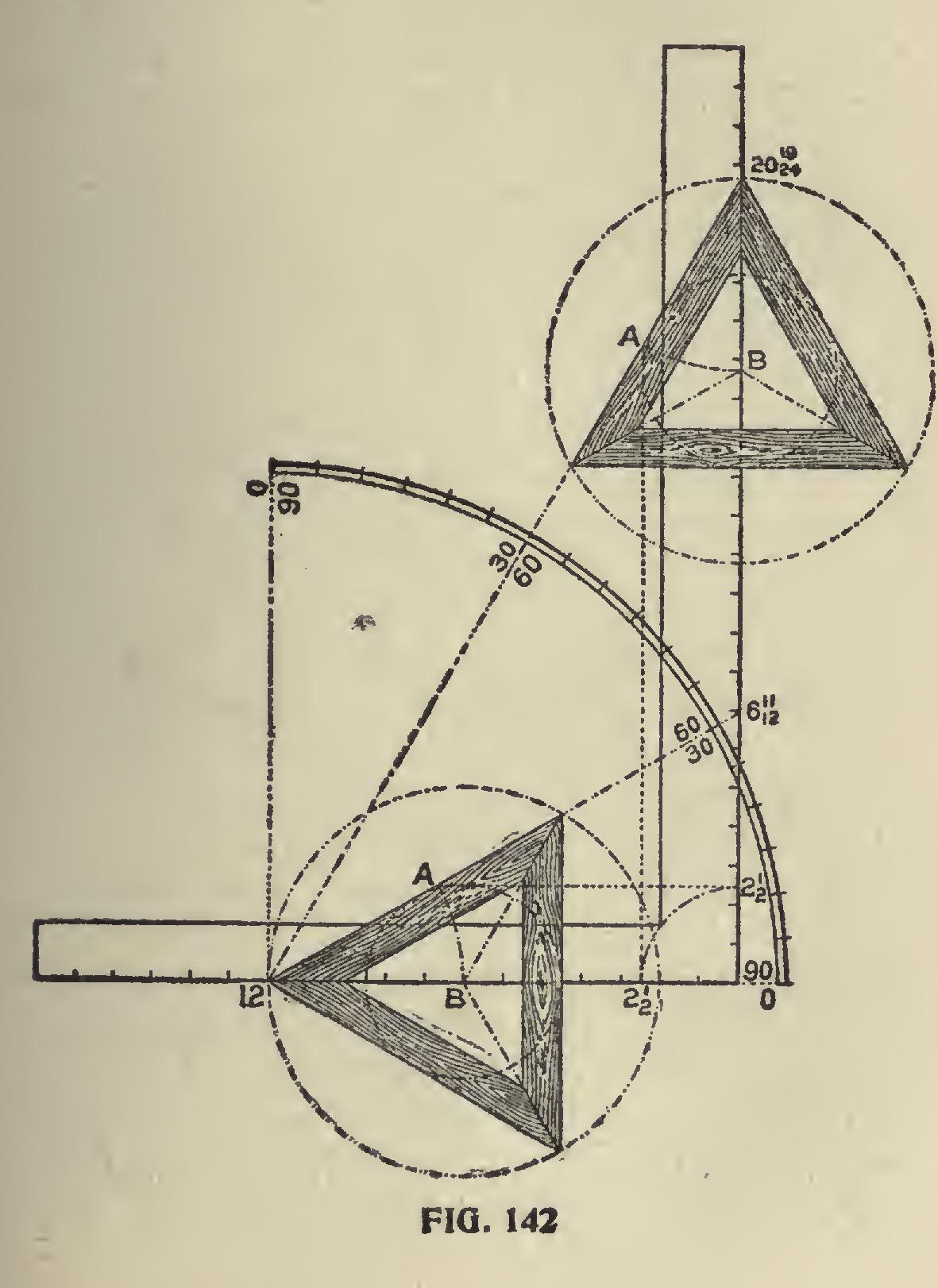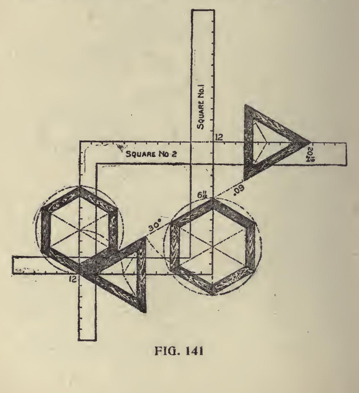 Degree Line of Triangle and Hexagon.—The triangle and hexagon are the only polygons whose miters can be had on the same degree line, which permits of using the same figures on the square as shown in Fig. 141. In this, we show two squares with but one degree line, which is 30 de grees on the square No. 1 and 60 degrees on square No. 2 and both giving the same cuts but reversed on the squares. Perhaps this point could be made more clear by using but one square as shown in Fig. 142. In this, the degree lines are shown for the 30 and 60 degrees and both giving the miter for the triangle. The tongue giving it in the former and the blade in the latter. In this ex ample, we show how to lay off a triangle of any inscribed diameter by setting off the radius, say 21 inches on the blade as shown, and squaring out to the degree line as at "A." Then with the length from 12 to "A," set off on the tongue will locate the center as at "B," or vice versa if the cut is wanted on the blade.