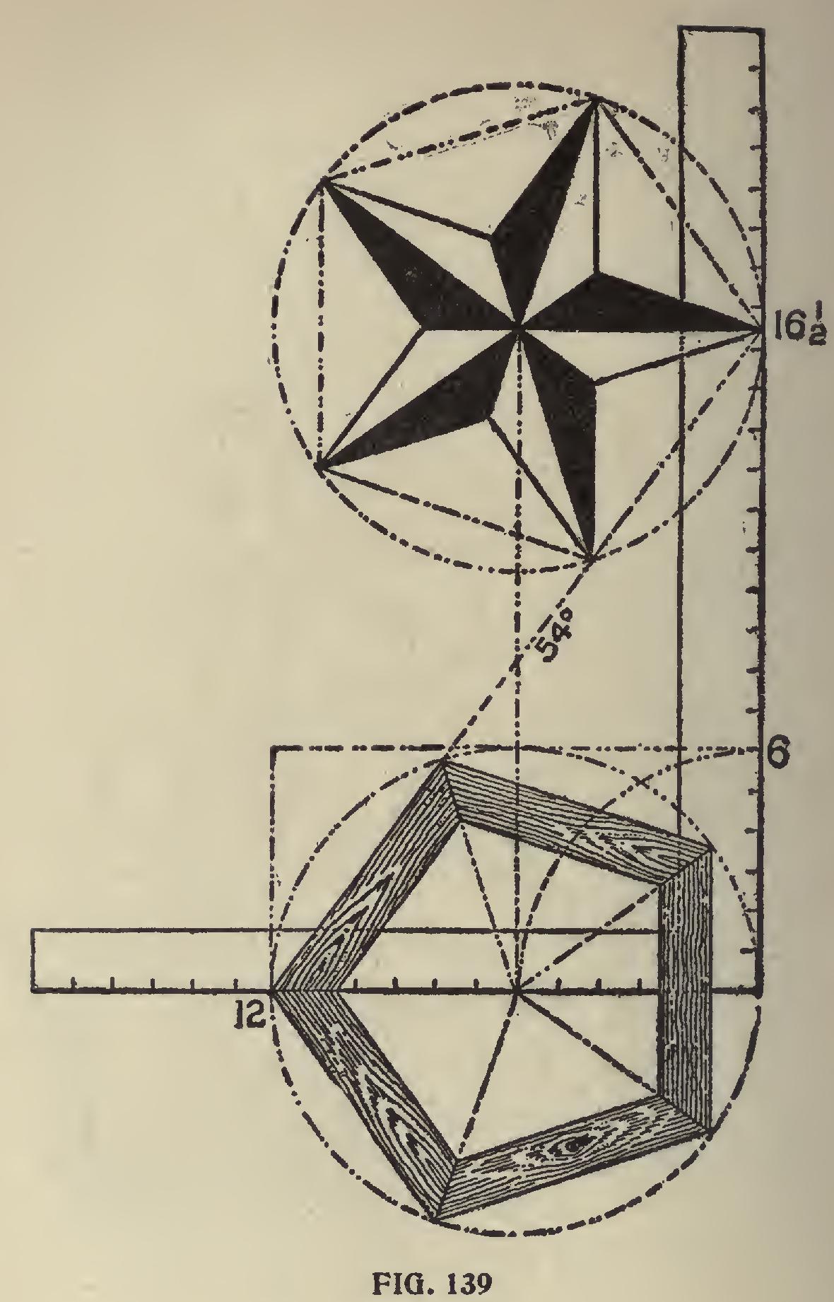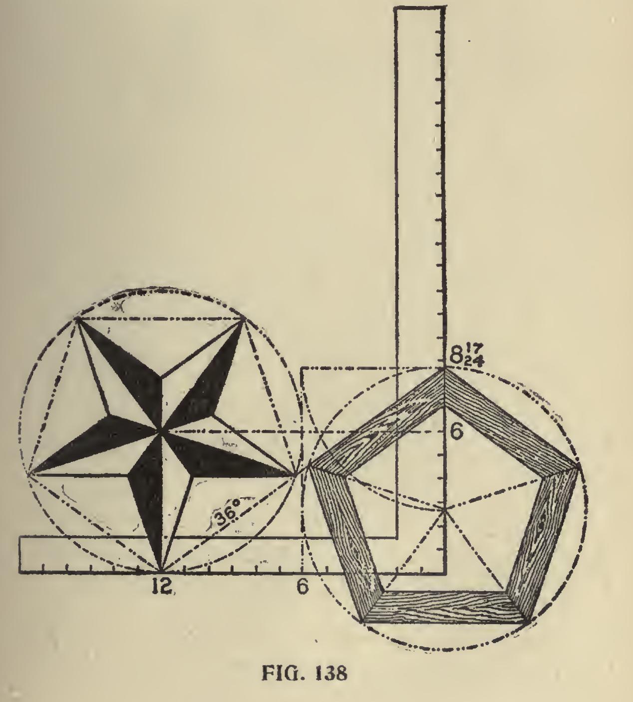 The 45-degree line, being at the half-way place on the square, remains unchanged. To illustrate this point a little further, we show two squares in a different position, as shown in Fig. 137, using the same figures on the squares as in Fig. 136 for the 36 and 54-degree line. Taking the squares separately, we show in Fig. 138, using the 36 degree line, the pentagon miter on the blade and the pentagon star resting at 12 on the tongue; while in Fig. 139, using the 54-degree line, the reverse is shown. In both of these illustrations the pentagon frame and star are inclosed in a circumscribed diameter of 12 inches, but they could be of any desired size.