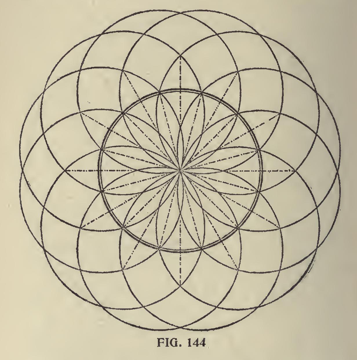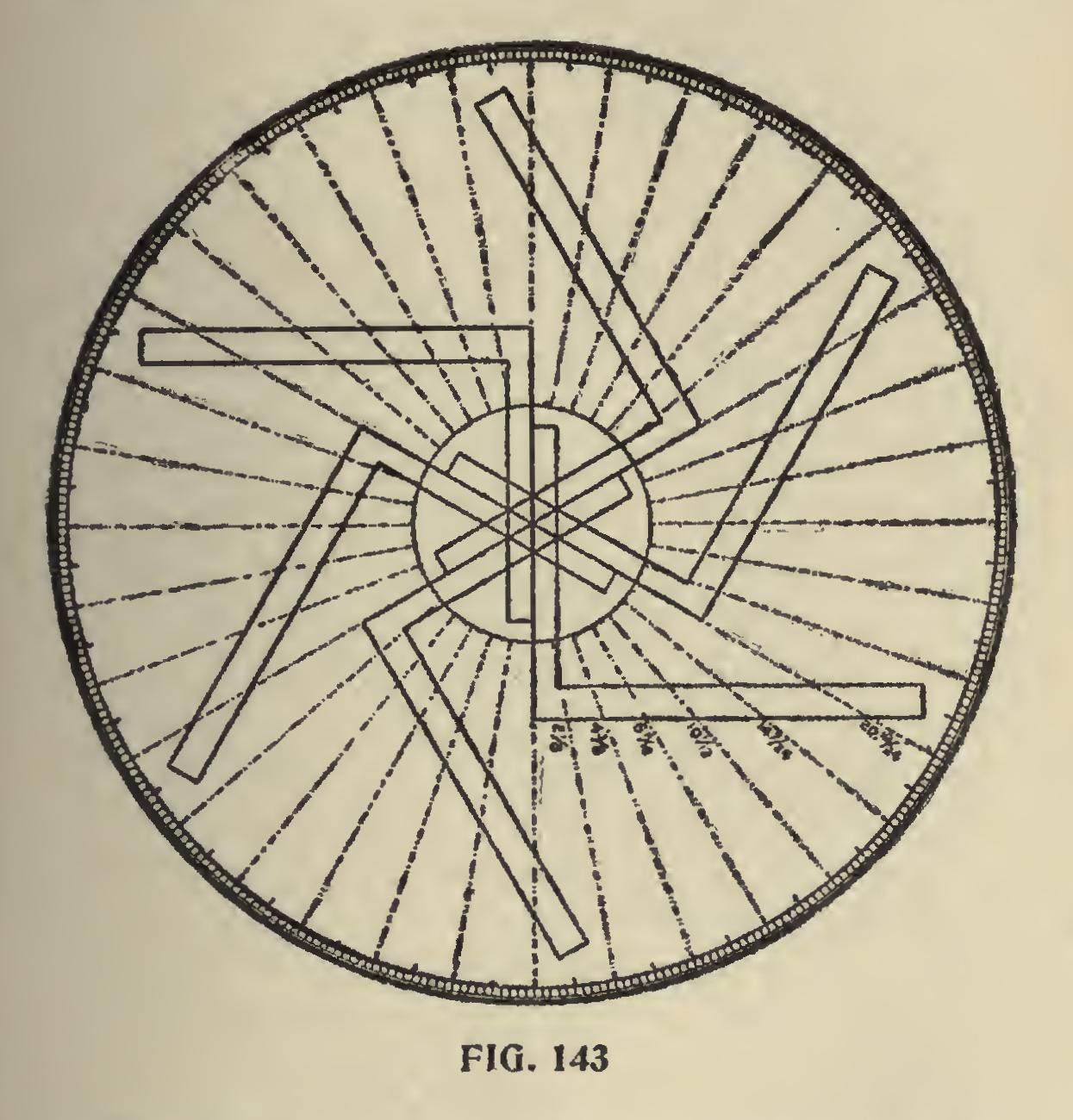 In Fig. 143, we show a circle with the degree divisions spaced on same with the aid of the steel square. We do not claim this to be the best way, nor would we use this method if we had a job of this kind to do, but it can be done and that very accur ately, by letting 12 on the tongue rest at the center and checking on the blade as follows: 2i, 41, 6 11-12, 10 1-12, 14 7-24 and 20 19-24 inches, which places the degree lines ten degrees apart. Then swing the square till the tongue rests in line over the last check and repeat the markings. Six movements of the square will complete the divisions and with a straight edge, which may be the blade of the square passing from the center and over the check marks, will divide the circle in divisions of ten degrees, and these may be divided with a compass into ten spaces, designating the degrees. Of course, the whole circle could have been divided with the compass by first dividing the circle into quarters or sixths and these spaces again into the required divisions, but the reader will understand that we are illustrating what may be done with the aid of the steel square. How ever, it will not be out of place to show what may be done with the compasses alone in laying off the degrees on the circle as shown in Fig. 144, and may be drawn as follows: Laying Off Degrees With Compasses.—With the compass describe the degree circle and without changing the radius, set the needle point at any place on the circle, describe another circle and at the intersection with the first circle, describe another circle and continue until all of the inter sections have been used; then with a straight edge lay off the lines through the center to the intersection of the points of the outer circles. It will be seen that the degree circle has been divided into twenty-four equal divisions or 15 degrees apart. These divisions could be again divided in like manner down to 5 degrees by set ting the needle point at one-third of the space on the circle and thereafter on the intersections as described above.