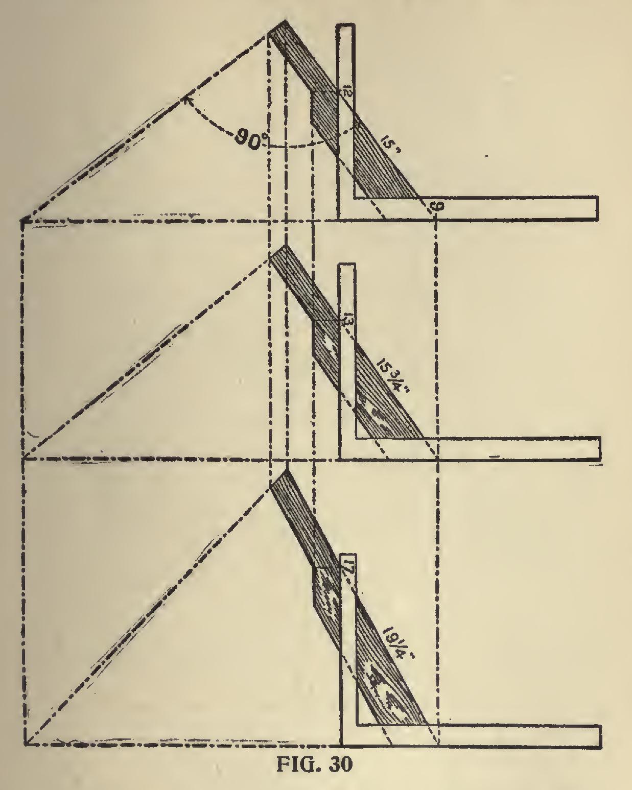 Then 12 and 9 give the seat and plumb cuts for the common rafter, 13 and 9 for the octagon hip or valley, and 17 and 9 give the same for the common hip or valley. In Fig. 30 we show each separately.
