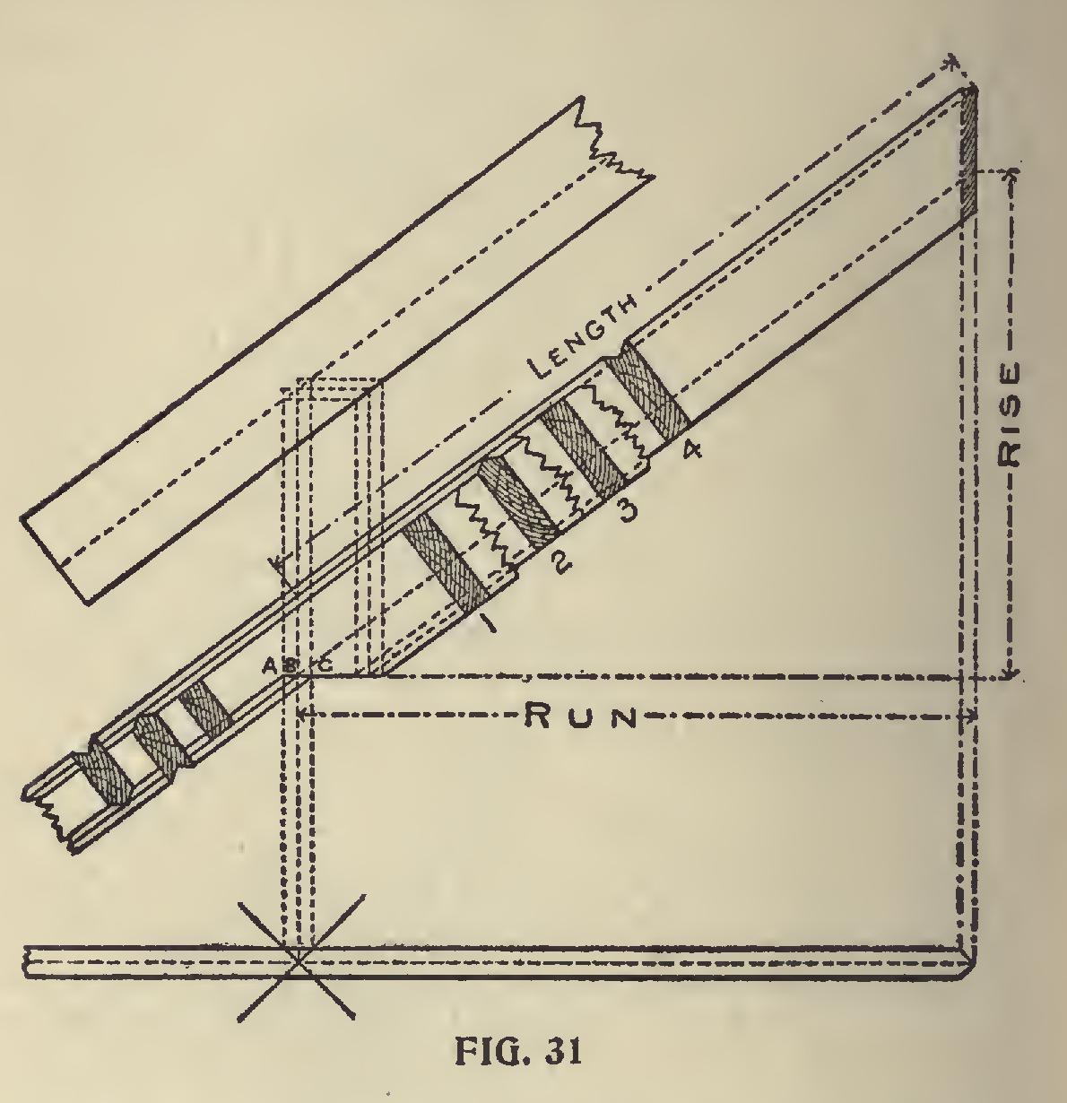 The Measurement Line of Hips and Valleys is a line along the center of its back, and just where to place the square on the side of the rafter so as to make the cuts and length come right at that point is a question that taxes the skill of most carpenters, especially so when the rafters are so backed. In Fig. 31, we have tried to make