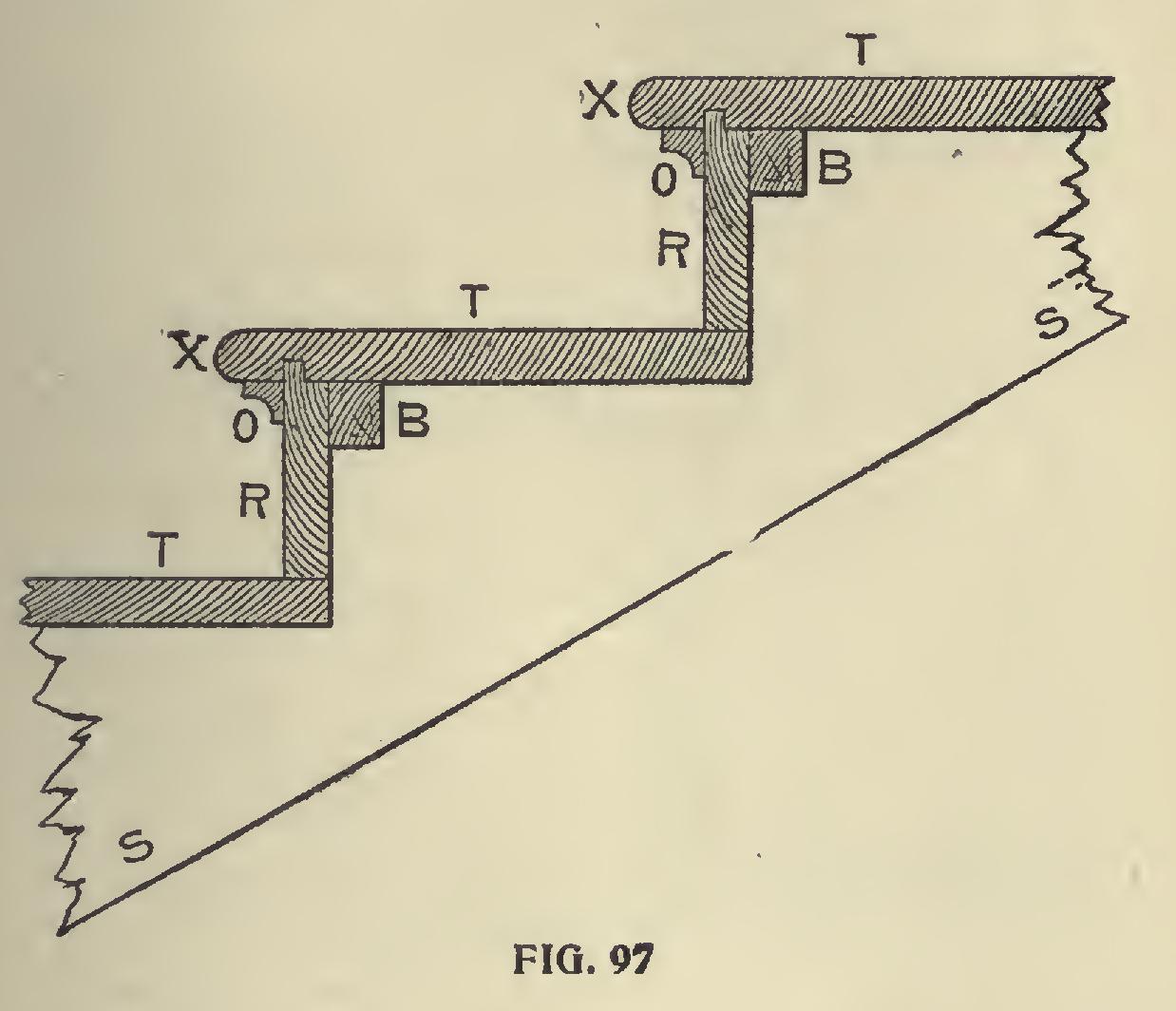 T, T shows the treads, R, R the risers, S, S the string; 0, 0 the cove moulding under the nosing X, X. B, B shows the blocks that hold the tread and risers together. These blocks should be from four to six inches long, and made of very dry wood. Their section may be from one to two inches square. On a tread three feet long, three of these blocks should be used at about equal distances apart, putting the two outside ones about six inches from the strings. They are glued in the angle.