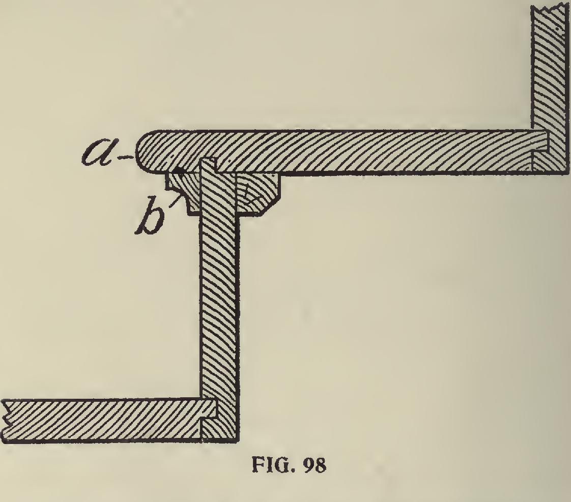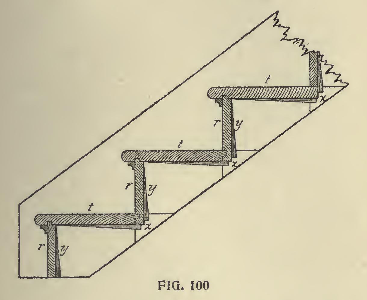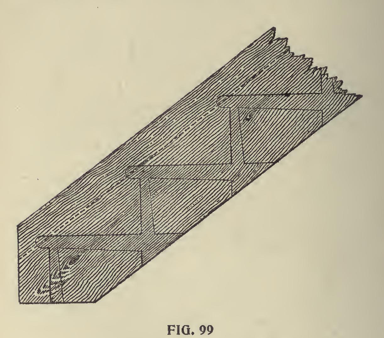 In Fig. 98 a scheme for the construction of the tread and riser is shown. The tread has a lip worked on it at the back edge, which enters a groove ploughed in the riser. The riser also has a lip left on the upper edge, which goes into a groove made in the tread similar to the method shown in Fig. 97.