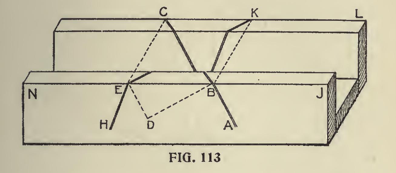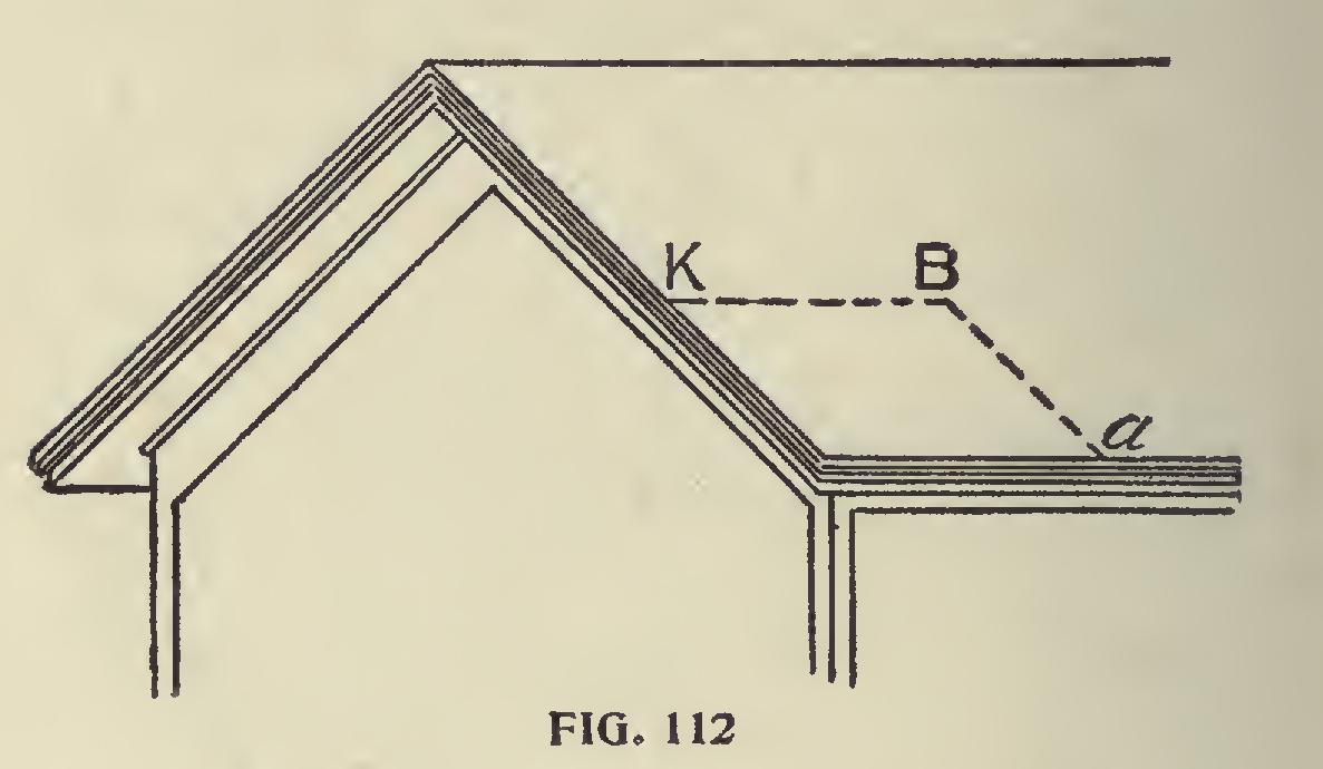 From Descriptive Geometry we have the prin ciple, that if we have given two intersecting lines contained in a plane, we know the position of that plane; hence we may represent the plane of a roof by the line Ba and Bk (Figs. 111 and 112); and since it will be most convenient to measure the distances required in a direction perpendicular to that plane, in following out the principle draw lines from the points cef, etc., parallel to Ba and intersecting the line Bg, which is made perpendicular to Ba. This gives us on Bg the perpendicular distance of the points cef, etc., from the line Ba. From the intersections
