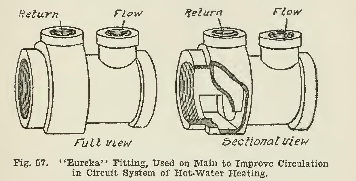 In Fig. 56, each of these special fittings is noted on the main; and we might say that one advantage gained by their use is that a single fitting, as in the case of the Eureka or Phelps type, takes care of both flow and return branches, thus overcoming additional pipe cut ting and the threading of the large pipe.