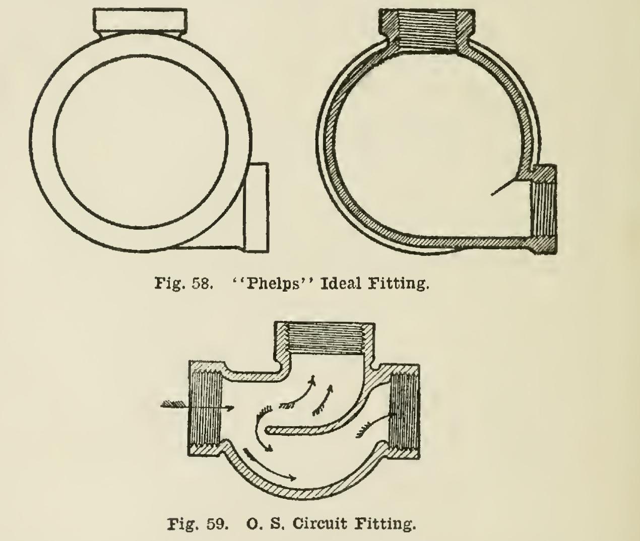 Fig. 56 gives a general idea of the construc tion of this system and the manner of making connections to the radiators. There are several special fittings which may be used on the main to improve the circulation, one of which—the "Eureka"—is illustrated in Fig. 57. The broken view shows the interior arrangement providing for the return of the circulation into the main on its under side, through the bottom of the fit ting. Fig. 58 shows a special style of tee having top and side on a line, with outlets at the top and bottom; this device is known as the Phelps Ideal Fitting. The 0. S. Circuit Fitting is shown in Fig. 59.