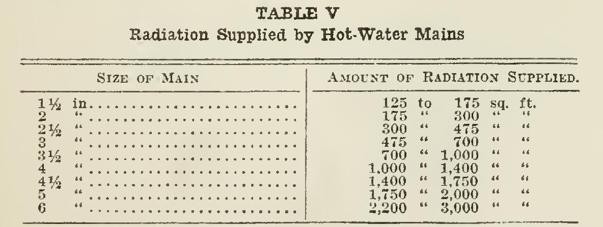 For a circuit job of hot water, use the size of main indicated for the minimum amount of radiation in Table V. For example, for 475 square feet of radiation, use a 3-inch main; for 1,000 square feet of radiation, a 4-inch main; and so on.