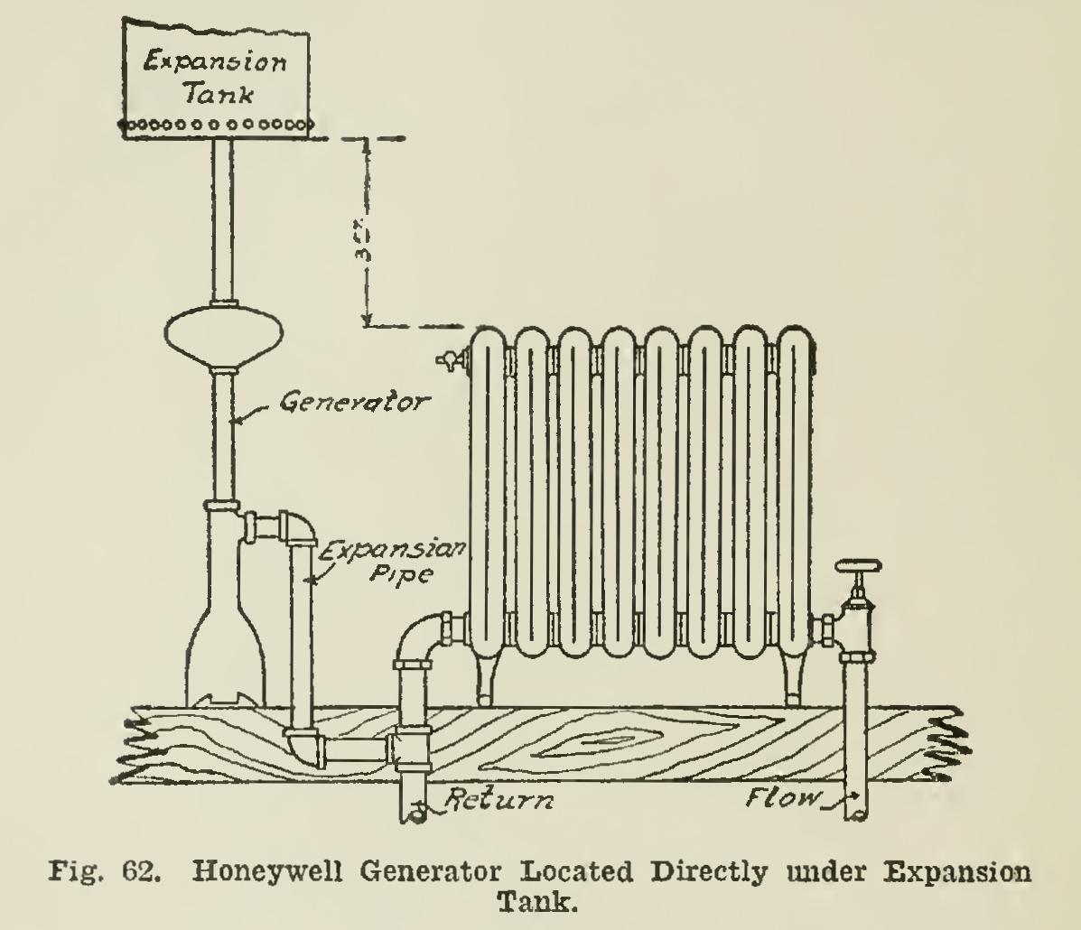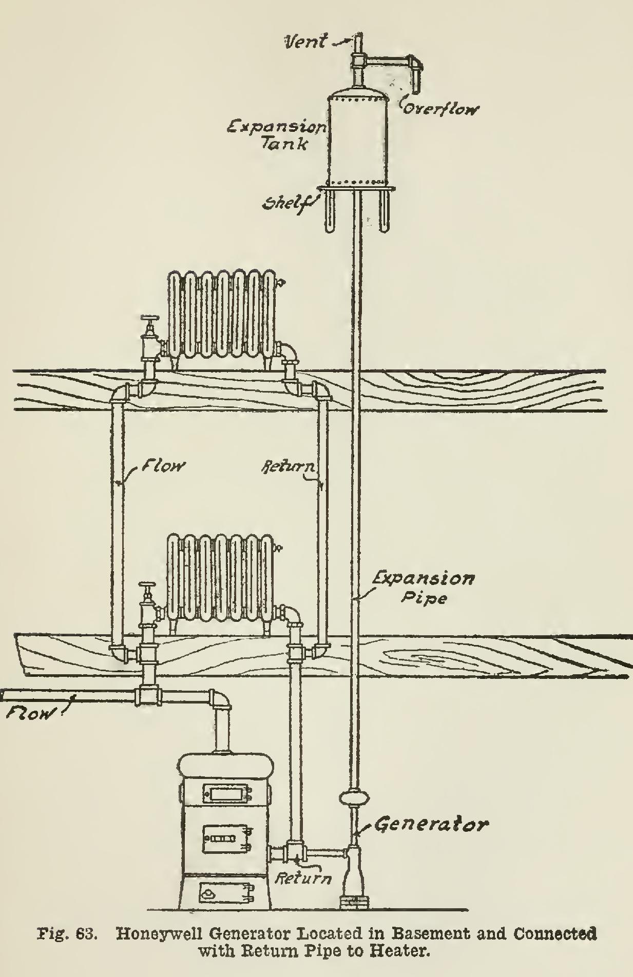The generator may be located directly under the expansion tank, as illustrated in Fig. 62, or it may be placed in the basement near the rear of the heater, and from here connected with the return pipe, as shown in Fig. 63. Of the two, this latter position is the one preferred. In the event of such location, the expansion pipe is connected from the top of the generator, whence it rises to the ceiling of the basement, and is car ried along until a point is reached where it is convenient to rise to the expansion tank.