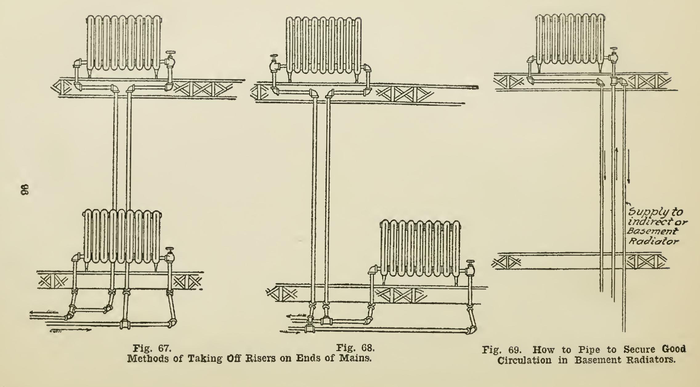 Piping for Accelerated Systems. Installa tions of accelerated systems call for radical changes in the method of making pipe connec tions. Owing to the small sizes of the piping, it is advisable to take all branches from the side of the main and to have them enter the side of the return, as shown in Fig. 65. The hot water will then flow to the end of each line before en tering the branches, for, as previously stated, the heated portion of the water always hugs the top of the main and each branch will receive its proper supply of hot water at about the same time. There are some modifications of this method, however. For example, when a branch near the heater feeds a riser to the upper floors without supplying a first-floor radiator, it is sometimes advisable to make the connection to the branch from the bottom of the main, as shown in Fig. 66. No riser should be taken from the end of a main, if such a connection can pos sibly be avoided. Take the connection to first floor radiator from the end of a main, and the branch to riser from the side of this connection. Figs. 67 and 68 show two methods of accomplish ing this, either one of which may be followed with success. In feeding basement radiators of either the direct or indirect pattern (described later), the supply should be taken from a riser at some point above the ceiling of the first floor; and the radiators should be fed from overhead by this drop pipe, as illustrated in Fig. 69.