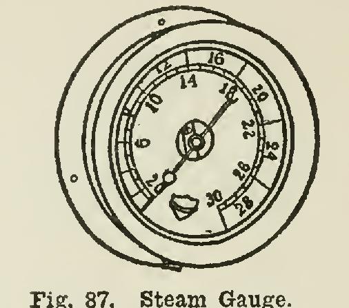 A steam gauge, Fig. 87, should be attached to every steam boiler. The gauges used are ordi narily of the Bourdon type, and consist of a hol low tube bent into circular form. One end is attached to an opening in the bottom of the gauge to which the steam supply is connected.