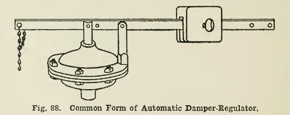 A steam boiler should invariably be fitted with an automatic damper-regulator, which opens or closes its draught doors according to pressure of steam on the boiler. This attach ment may be so set as to cause the draught door to remain closed and the check door open, or so that a certain pressure of steam will operate both doors automatically. In the construction of this regulator, usually two castings in form resembling an old-fashioned soup plate are bolted together, with a rubber diaphragm be tween. The pot thus formed is connected to the boiler in such a manner that the dia phragm receives the pressure of steam against its lower side, raising its center against a plun ger inserted through an opening in the top casting or half of the pot. A rod bolted to this