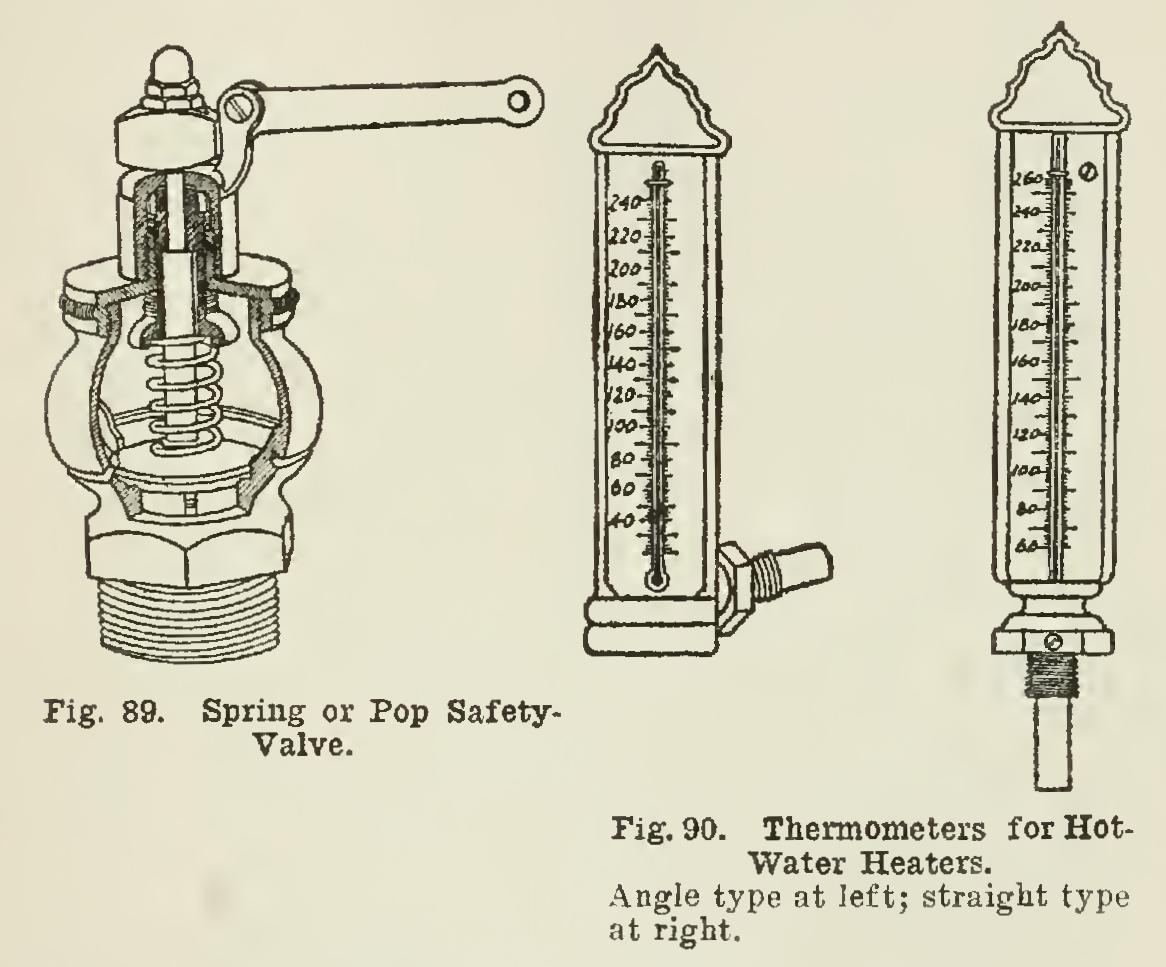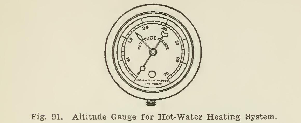 Hot-water heaters are provided with a special form of thermometer, as shown in Fig. 90, for indicating the temperature of the water in the heating system, and also with an altitude gauge, Fig. 91, which indicates at the heater the height of the water in the sytem.