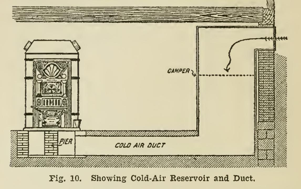 Cold-Air Supply. No hot-air furnace will do its work properly unless provided with an ade quate cold-air supply. In the cheap form of in stallation, it is invariably noted that the furnace is supplied with basement air through a fret work base of the furnace. Aside from showing poor practice, this method creates an unhealth ful condition. Air from outside the building itself should be used; and the necessary supply should, if possible, be admitted from the north or northwest sides. A cellar window may be utilized for the purpose. Just inside the cellar window or other similar suitable opening, the cold-air duct should be enlarged to about three times the required capacity. From the bottom of this duct the connection with the furnace may be made, the pipe running either below the floor of the cellar or above it, according to cir cumstances surrounding the installation. This large duct forms a reservoir for the accumula tion of cold air, and this reserve supply prevents prevailing high or variable winds from inter fering with the steady flow of air to the furnace.
