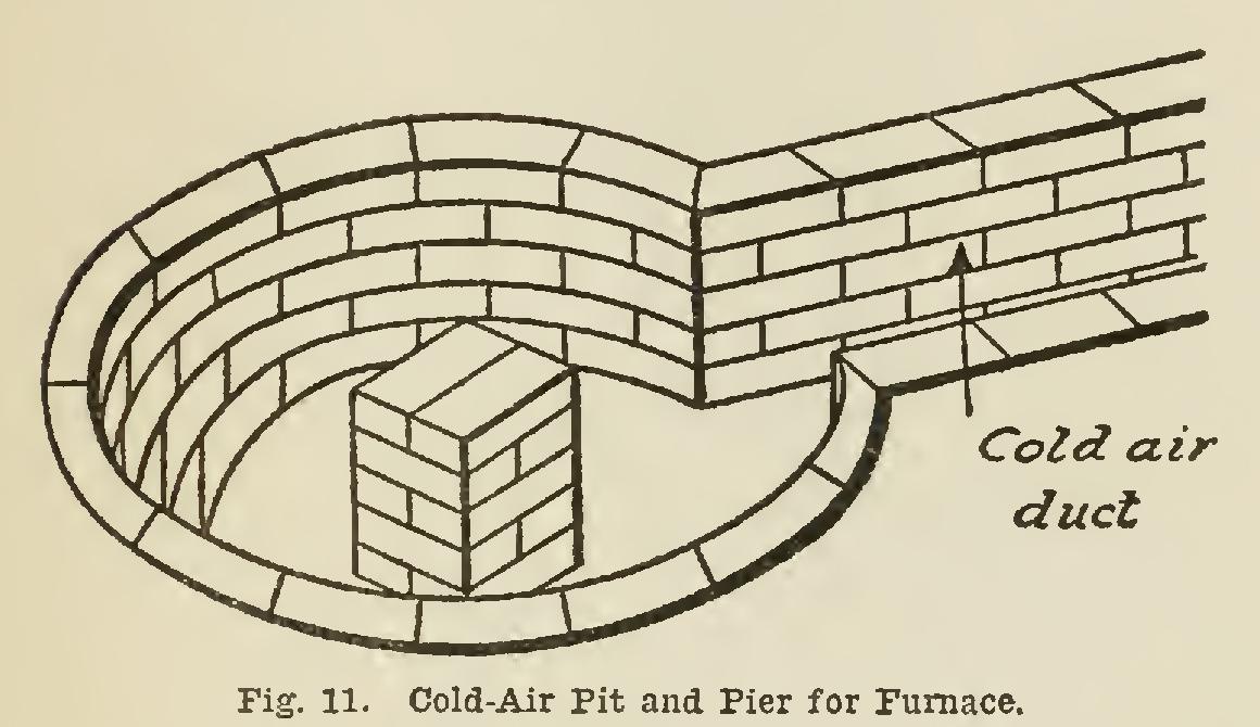 Fig. 10 will illustrate this idea. The outside entrance to the opening should be protected with a coarse wire screen fastened in a permanent manner. We favor the building of a cold air pit of brick beneath the furnace, as illustrated in Fig. 11.