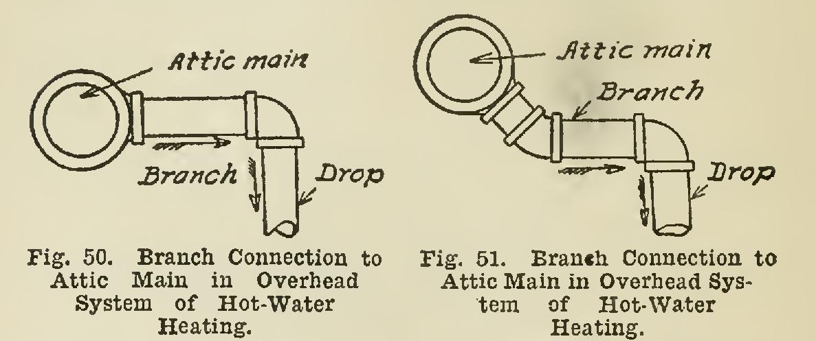 Fig. 49 will give a very clear idea of the adaptation of the system. At or from the top of the main riser, the various attic mains are connected. These pitch down from the main riser, being run in the most convenient manner to supply the various drop pipes, which in turn feed the radiators on the several floors. Refer ence to the illustration will show several meth ods of connecting the radiators to the drop sup ply pipes. The one taken directly from the drop supply to the top of the radiator is the method most fiequently used. By the usage of this top
