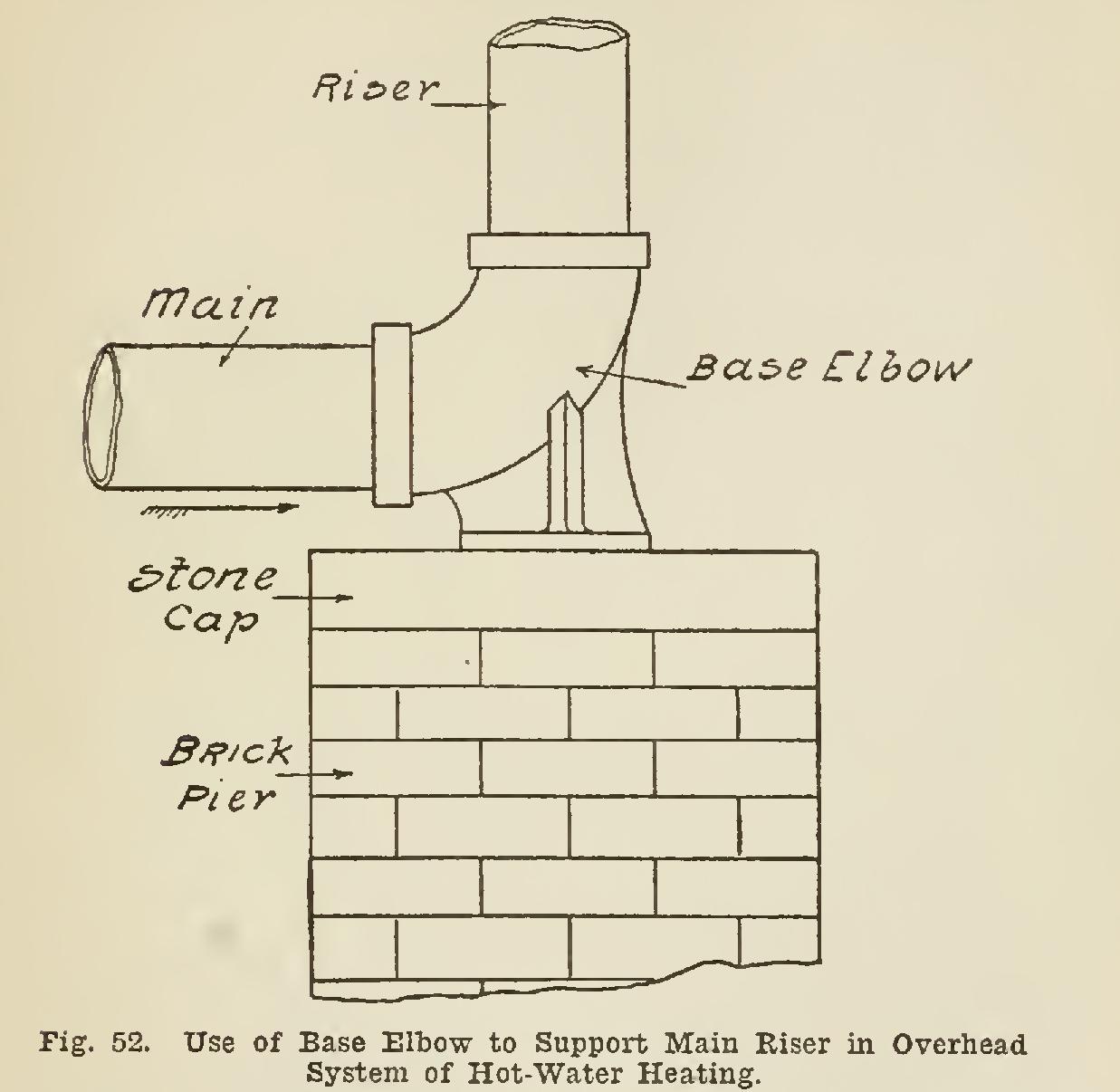 The branches in the attic are taken from the side of the main as indicated in Fig. 50, or from the bottom of the main at an angle of 45 degrees as shown in Fig. 51, inasmuch as connections made in this manner prevent the formation of air pockets in the piping. The main riser should be supported either on a brick or stone pier or on a substantial wall in the basement, in order to prevent the sagging likely to be caused from the excessive weight it carries. A special elbow called a base elbow should be applied at the bot tom in the manner illustrated in Fig. 52.