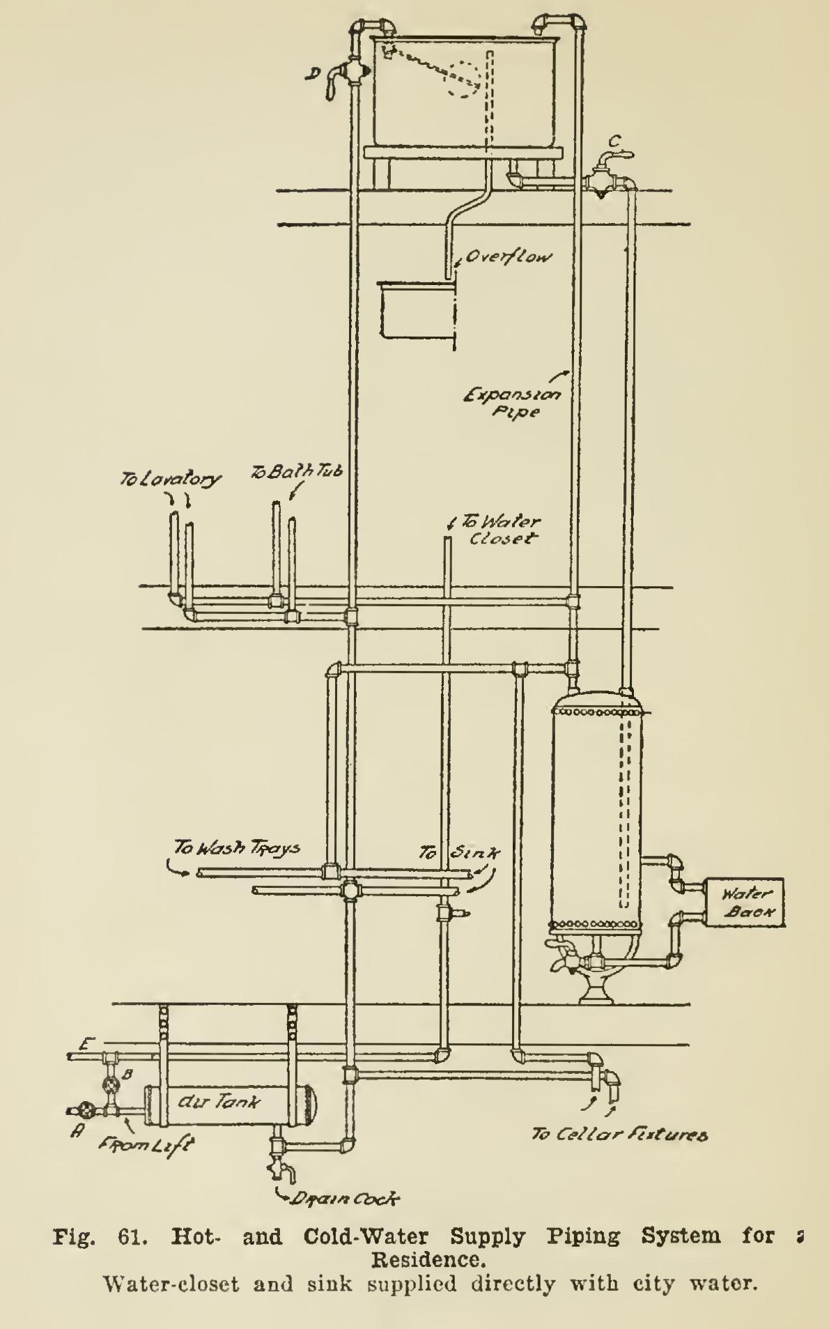 Fig. 61 shows a piping system in which the fixtures, with the exception of the water-closet and sink, are supplied with soft water, these two fixtures being supplied with city water. On the riser from the water-lift, at the attic tank, is placed a ball-cock such as is used in the tank of the water-closet, which maintains an established amount of water in the tank, and, when any water is drawn off, will automatically replace the amount used. The sketch shows the fix tures supplied with cold soft water, from the riser from the lift running to the tank; and the cold-water supply to the range-boiler is taken from the tank directly. When ordinarily used, the valve B is closed; but in case the soft-water supply gives out, closing valve A and opening valve B will admit city water into the entire piping system. The attic tank provides a re serve supply of water in case the city water is shut off temporarily. By cross-connecting the pipes D and C, and placing a check-valve on pipe E and the cross connection, when the pres sure goes off the riser pipe to the attic tank, the check-valve will allow the water from the tank to enter the piping system, and the check-valve at E will prevent the water from going out to the street mains, this operation being reversed when the city pressure comes on again.