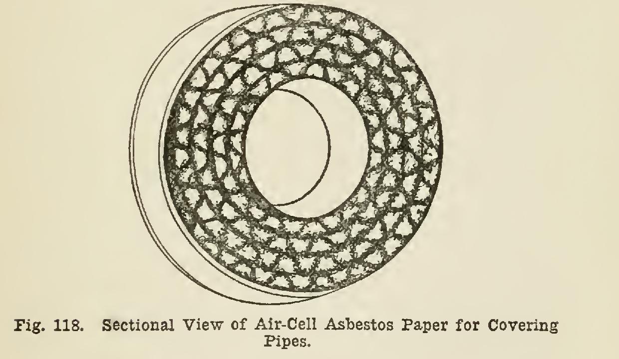 For ordinary low-pressure heating and for hot-water work, a less expensive covering may be employed to insure satisfactory results. On such jobs, several layers of felt paper lined with asbestos, or strips of corrugated asbestos, or a covering made of ground cork, can be em ployed to advantage. Felt or asbestos paper specially wound to form air cells running lengthwise with the piping, affords a practical covering. Fig. 118 shows a cross-section of this