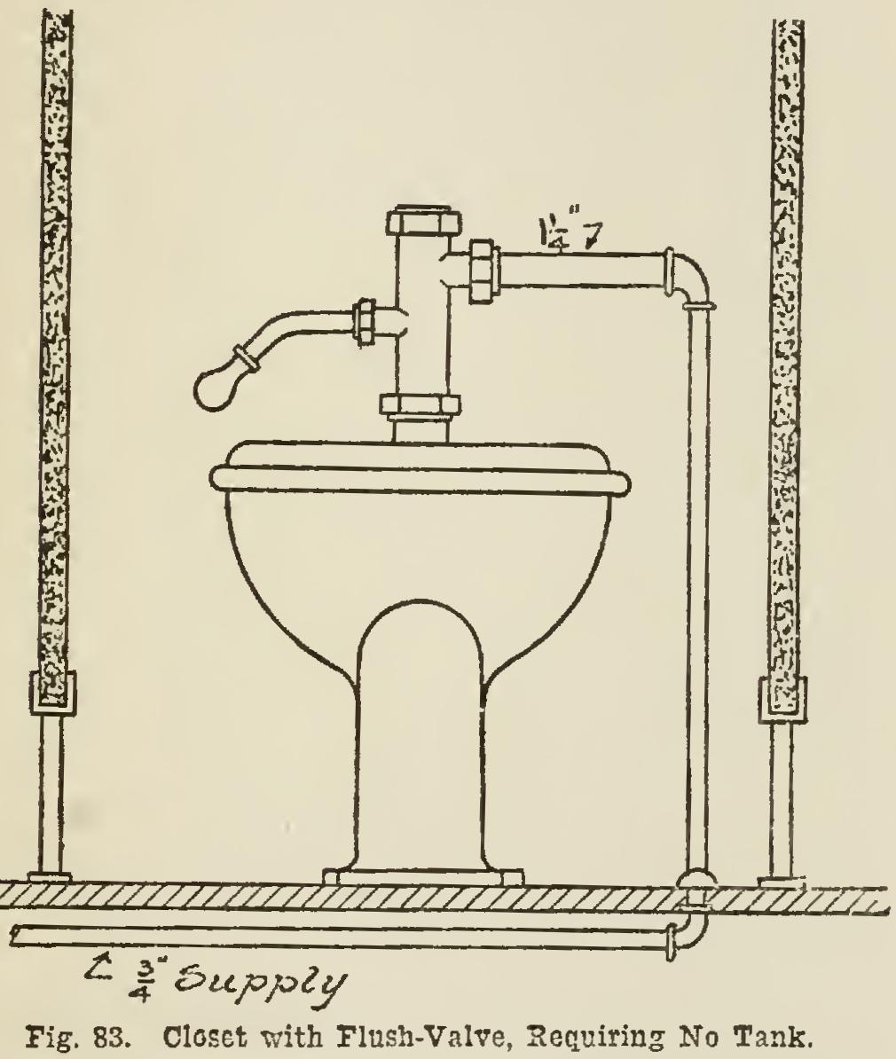 Fig. 84 shows a method of installation where the water-supply pressure is light, and the sup ply-pipe is small. A small, closed tank, or a chamber made of pipe, is placed above the high est fixture, at any convenient point; and this will give ample pressure and volume of water to operate the valves successfully. The successful working of valves of this type depends entirely upon two factors—namely, sufficient pressure and sufficient volume of water. They may be