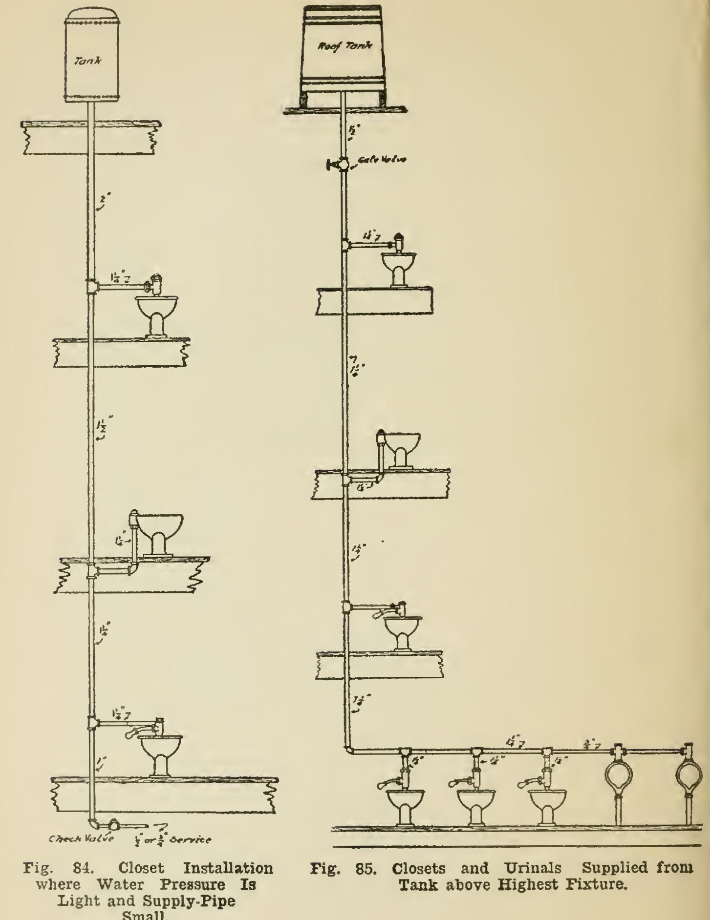 Fig. 85 shows a number of fixtures supplied from a tank placed above the highest fixtures, either in the attic or on the roof. This tank can be supplied with water through a ball-cock which will allow water to enter the roof tank when any is used for flushing the fixtures. Three different styles of valves are shown on the closets. The size of piping will be varied as fixtures are added or removed.