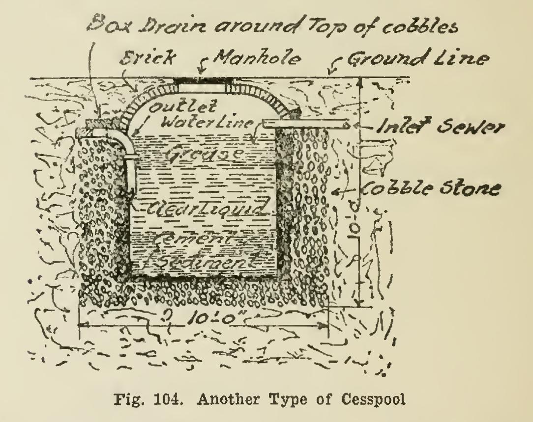 Fig. 104 shows another type of cesspool, in which the sides and bottom are cemented to a point above the discharge pipe, thus retaining the solid matter until it is reduced to a liquid state. The grease, remaining at the top of the pool, will not pass into the cobblestones placed around the outside of the pool to allow the water to pass from the outlet pipe quickly. The outlet pipe extends down below the line of the grease, thus passing clear liquid into the box drain placed above the cobblestones.