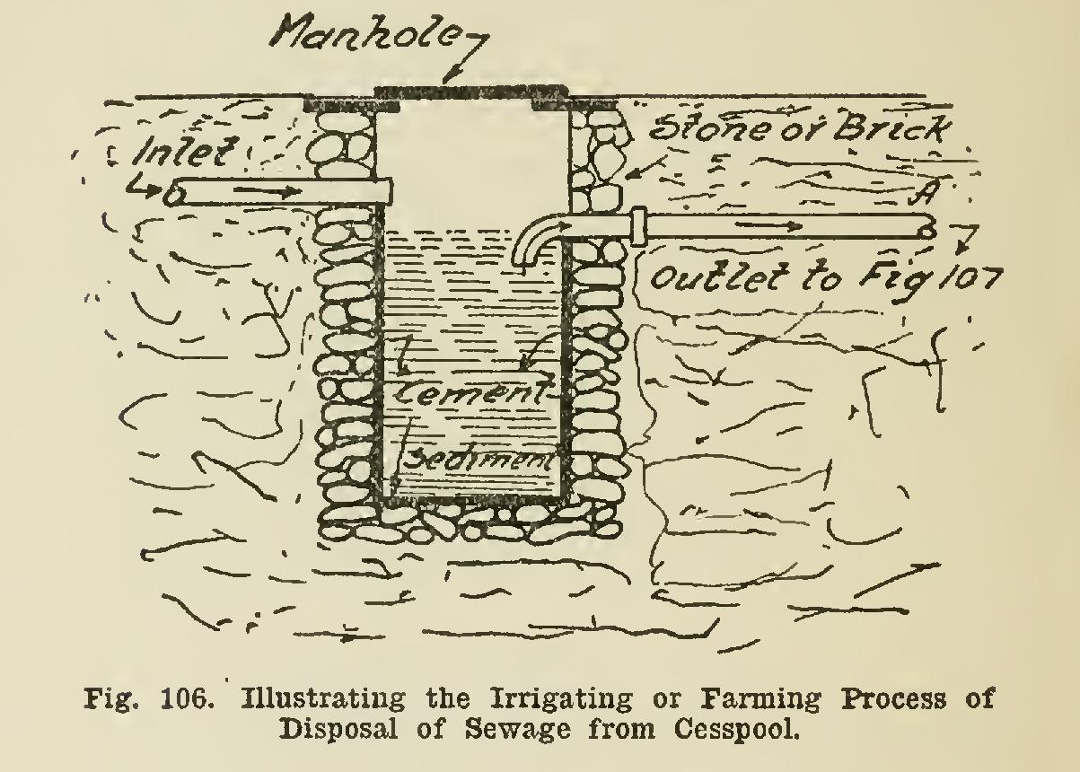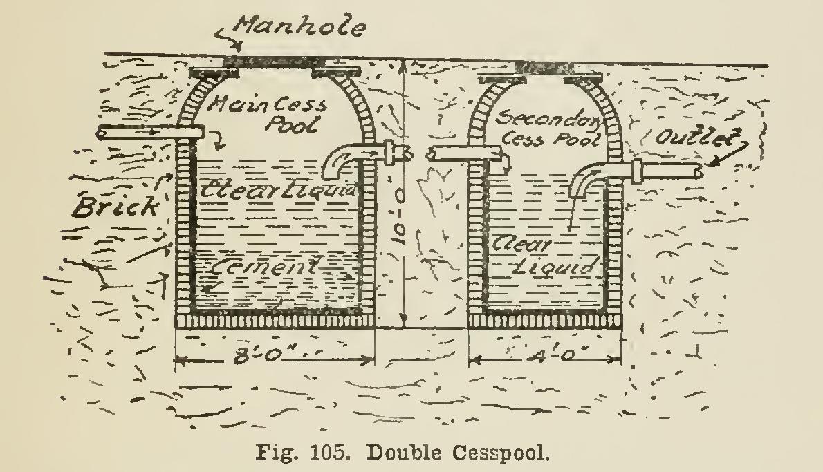 Cesspools are usually built circular in shape. The manhole cover on top will permit of access for cleaning when necessary—which is not often, as a rule, in porous soil, since numerous instances might be cited, of cesspools that have been in daily use for over twenty-five years without cleaning.