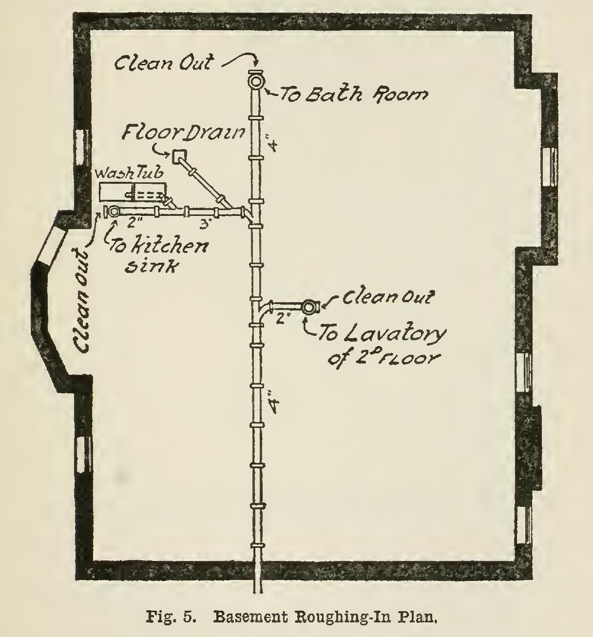 We shall now proceed with the roughing-in of an actual job. Suppose that we are to install the plumbing iu a house of which Figs. 5, 6, and 7 show the basement, first-floor and second-floor plans. The fixtures on the job are as follows: Basement 1 Two-part Wash Tray.