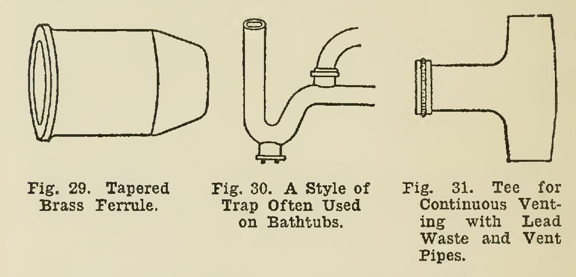 Fig. 26 shows a straight brass ferrule; and Fig. 29 shows a tapered brass ferrule, reducing down to the size of the waste-pipe used.