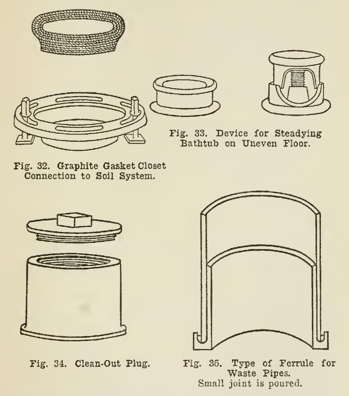 Fig. 32 shows a new method of joining the closet to the soil system, to be used instead of the putty joint that has commonly been used. This makes a very sanitary job, and insures a tight joint at this connection, which is by no means certain when putty is used. The brass flange is slipped over the 4-inch lead pipe ex tending through the floor for the closet connec tion; and then the pipe is sawed off at the proper distance to allow it to be flanged over into the brass floor-flange and then soldered. The graph ite gasket is next placed in position, and the closet is ready to be screwed in place.