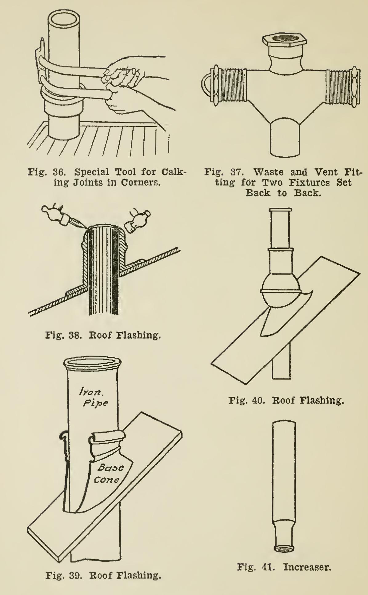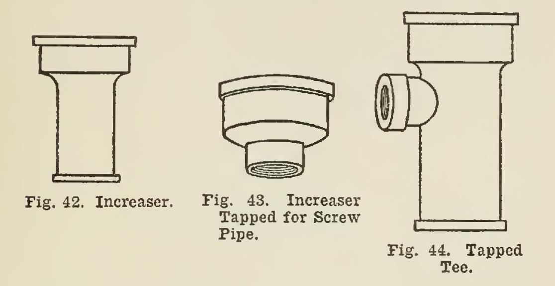 Figs. 41 and 42 show various styles of in creasers, which are used at a point just below the roof. They can be obtained either to calk-in as shown, or with the bottom end tapped for iron pipe to screw in. An increaser tapped for screw pipe is shown in Fig. 43.