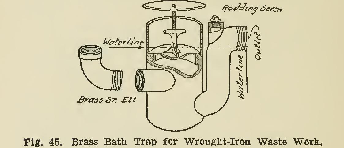 Fig. 45 shows a brass bath trap that is used where the waste work is all wrought iron—or, as it is sometimes called, the "Durham" system.