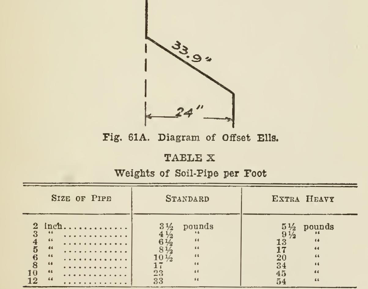 To Find Centers between Fittings. To find the length of piping required to connect fittings where offsets occur—that is, to determine the distance between fittings, center to center, mul tiply the length of the offset, in inches, by the factors indicated as follows: For 60-degree or 1/6 bends, multiply by 1.1547 " 45- " 1/8 " " " 1.4142 For example, suppose that it is desired to know the length between centers, of two 45 degree ells, when the offset is 2 feet (see accom panying diagram, Fig. 61 A). Since 2 feet=24 inches, we have: 24x1.4142=33.9+, or practically 34 inches, which, allow ing off for the ells, will give the length of the pipe re quired.