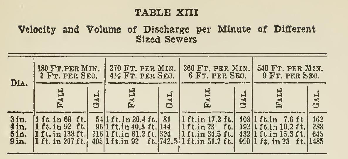 For example, a 6-inch sewer, laid to a grade of 1 foot, in 61.2 feet will have a velocity of 270 feet per minute, or 41/2 feet per second, and will discharge 324 gallons per minute. Other grades and discharges can be similarly figured from the table.