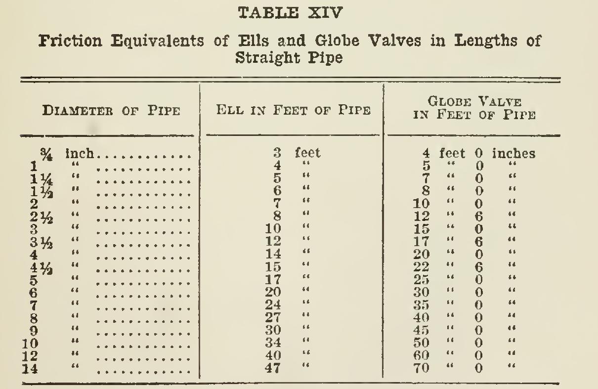 If, for example, it is desired to know the fric tion loss in a line of piping, caused by 2 ells and 1 valve, the size of pipe being 4-inch, by refer ring to the table, it will be seen that one 4-inch ell is equivalent in friction to 14 feet of pipe, and the 2 ells would therefore mean 28 feet, which, with 20 feet for the valve, would make a total friction equivalent of 28+20 feet, or a total friction loss equal to the friction loss in 48 feet of 4-inch pipe.