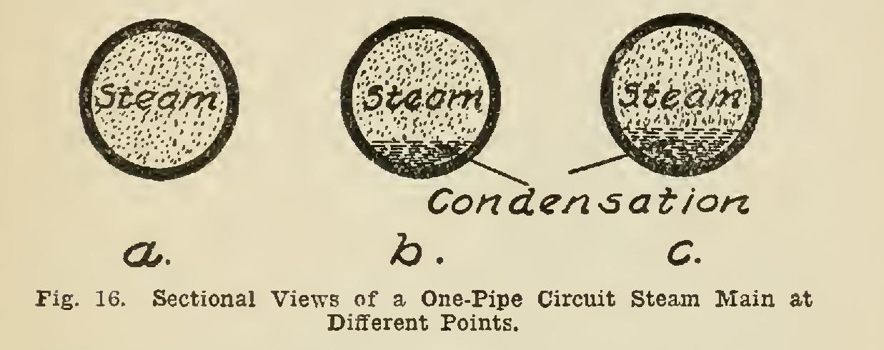 Fig. 15 shows the basement plan of a piping job of this character. The main acts as a reser voir supplying the various branches leading to the radiators, and also as a return pipe receiving the condensation from the various branches it feeds. By reason of this latter function, it should not be reduced, but should be run full size from the boiler to the end where the return connection is made. The condensation from the system runs along the bottom of the main in the same direction as the course of the steam. Fig. 16 illustrates three views of a main of this character, showing the extent of the reduction in its area due to the space occupied by the con densation; a designates the main as it leaves the boiler; b, the same main after the condensation from several branches has been returned to it; and c, this main at a point near to the return connection, showing possibly one-quarter of its area occupied by the condensation.