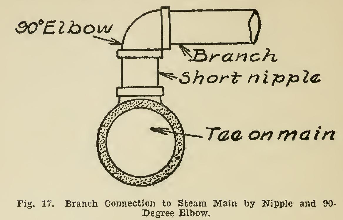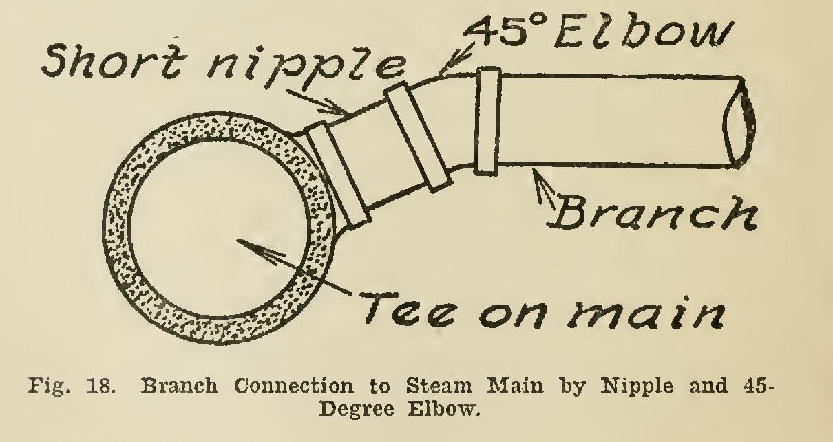 Each branch connection may be taken from the main by either of two methods—namely, (1) by using a nipple and 90-degree elbow, as illustrated in Fig. 17; and (2) by using a nipple and 45-degree elbow, as illustrated in Fig. 18.