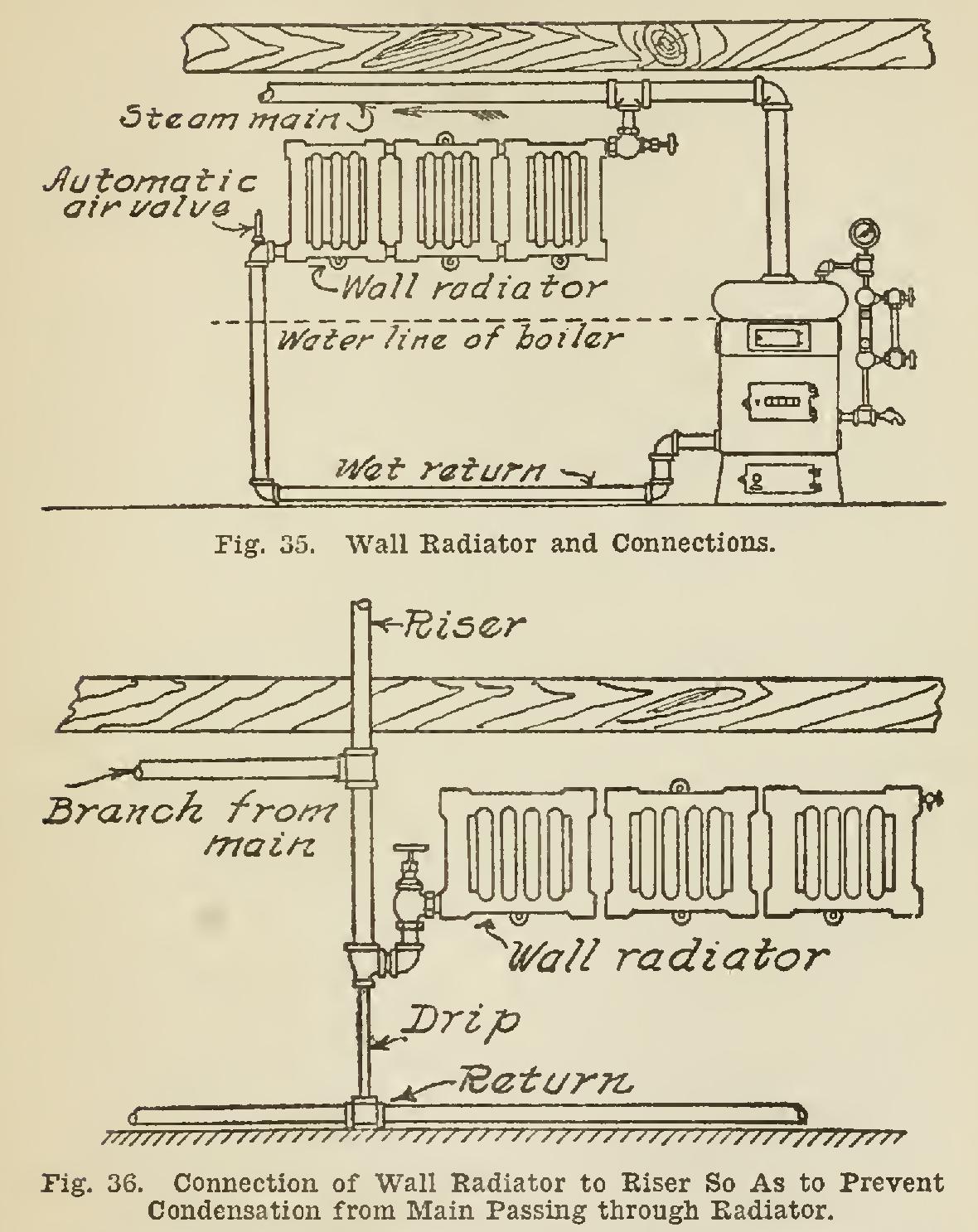 Radiators are sometimes placed on the wall of the basement below the main but above the water-line of the boiler; and for the purpose of such usage, a type constructed of flat panel shaped sections is employed. These forms are known as wall radiators, and the method of con necting them is shown in Fig. 35.