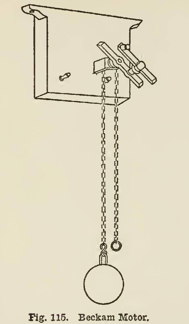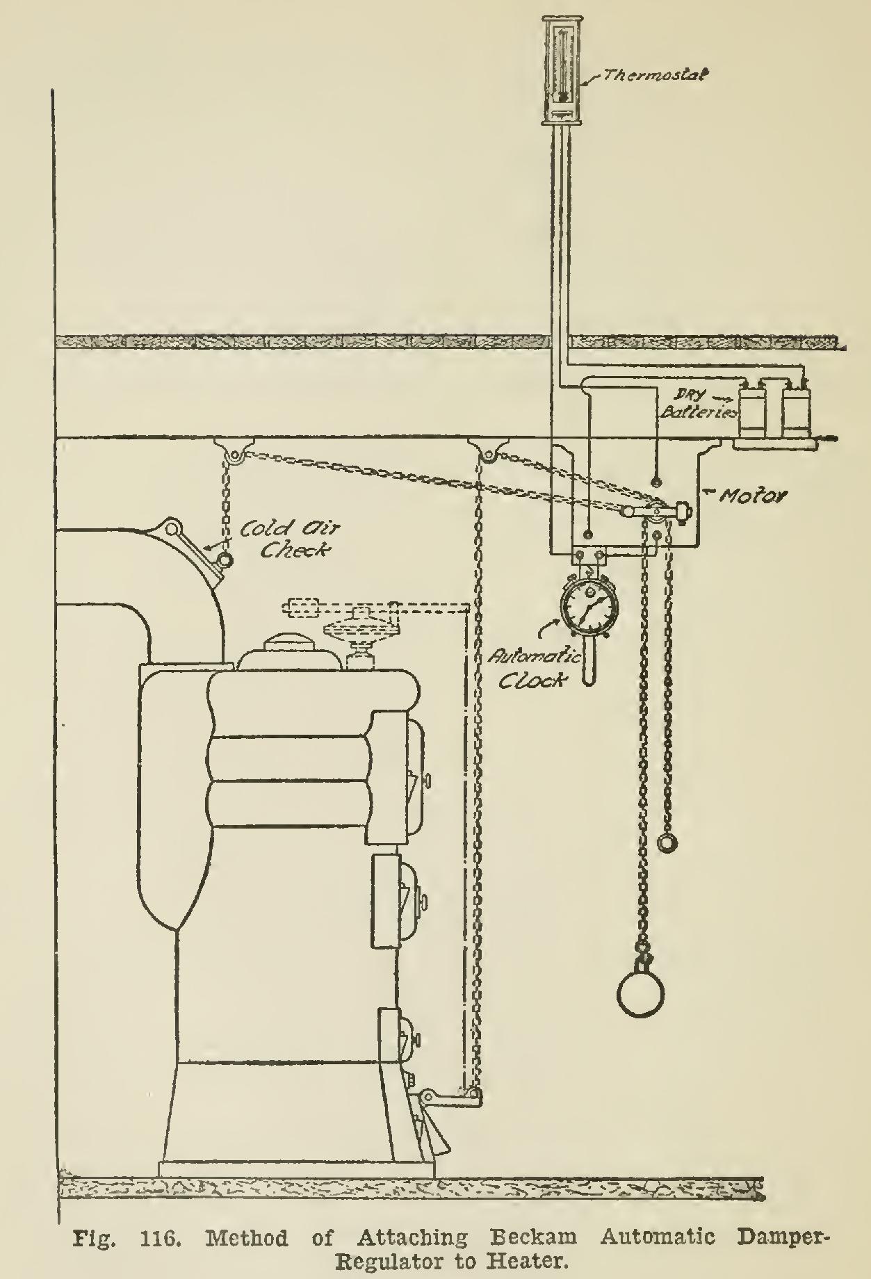 The motor may receive its power from a spring wound up within it; or, as in the Beckam types, the force to drive the motor may be gen erated by a weight wound up daily in much the same manner as a Swiss clock. Fig. 115 illus trates the Beckam motor; and Fig. 116, the method used for attaching the various parts to the heater, the light dotted lines showing how the connections are made to a steam boiler.