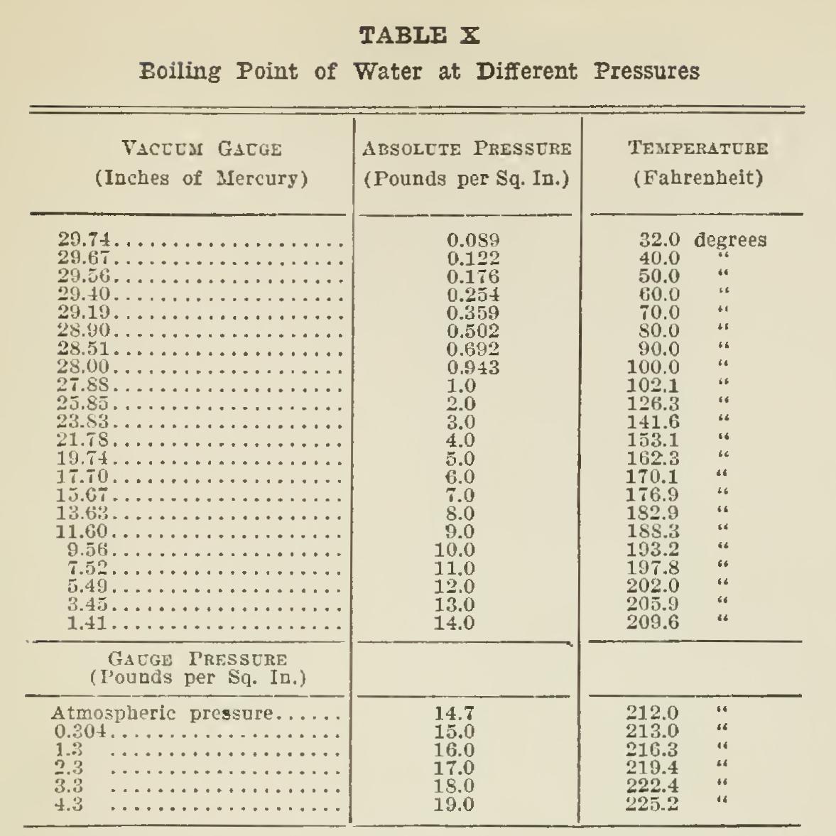 Table X gives the boiling point of water at different pressures, from complete vacuum (29.74 in. in the mercury column) to steam at 4.3 pounds pressure, or an absolute pressure (considering that of the atmosphere as 14.7 lbs.) of 19 pounds.